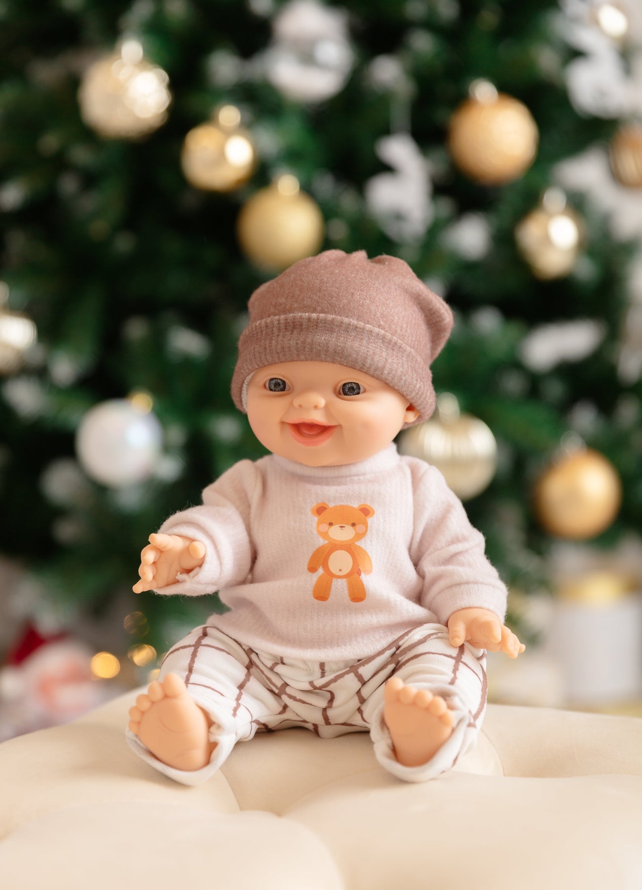 • Clothing included (teddy bear sweater, plaid pants and hat)