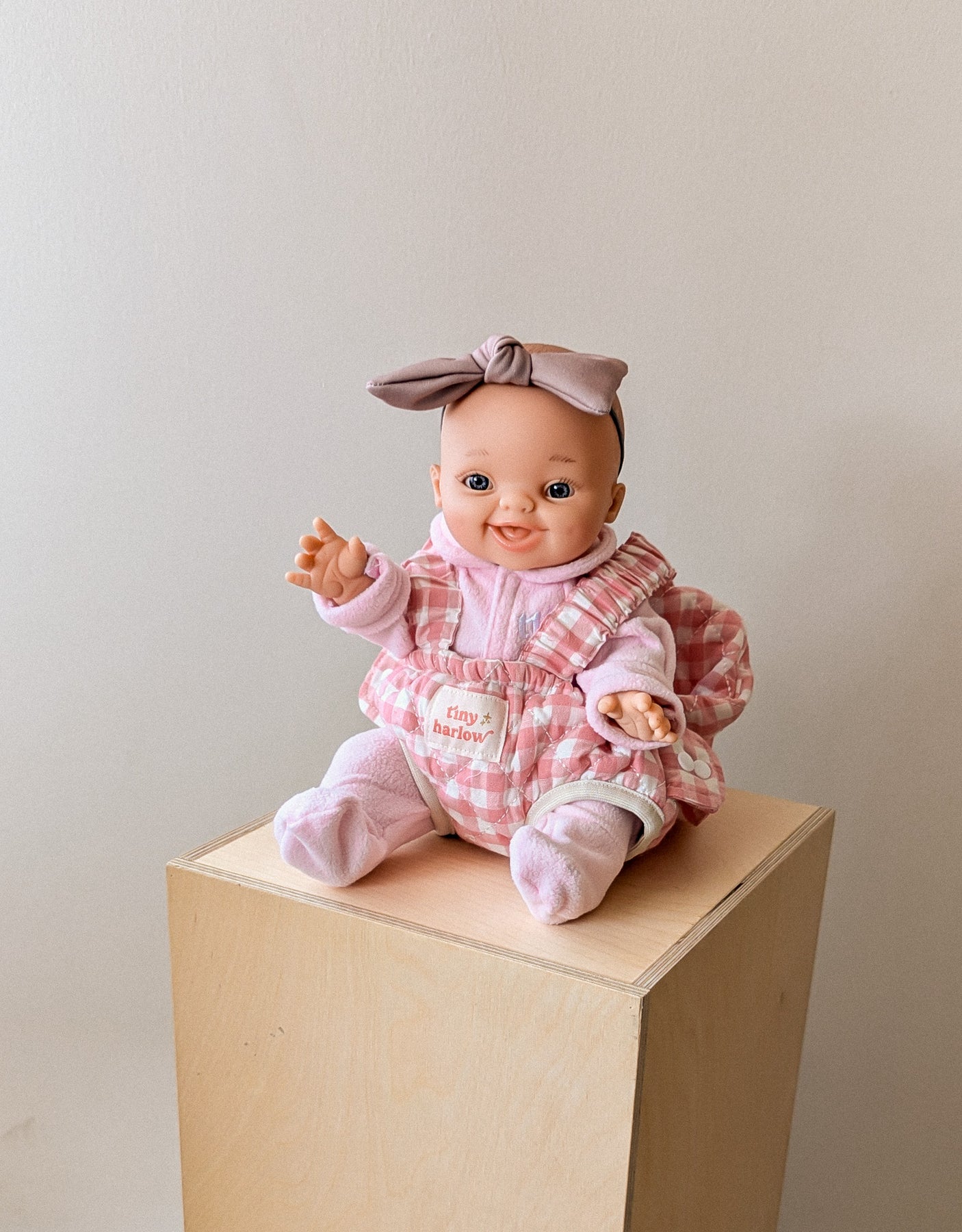Carry your favorite doll in style and comfort with the Tiny Harlow Doll Carrier in pink gingham!